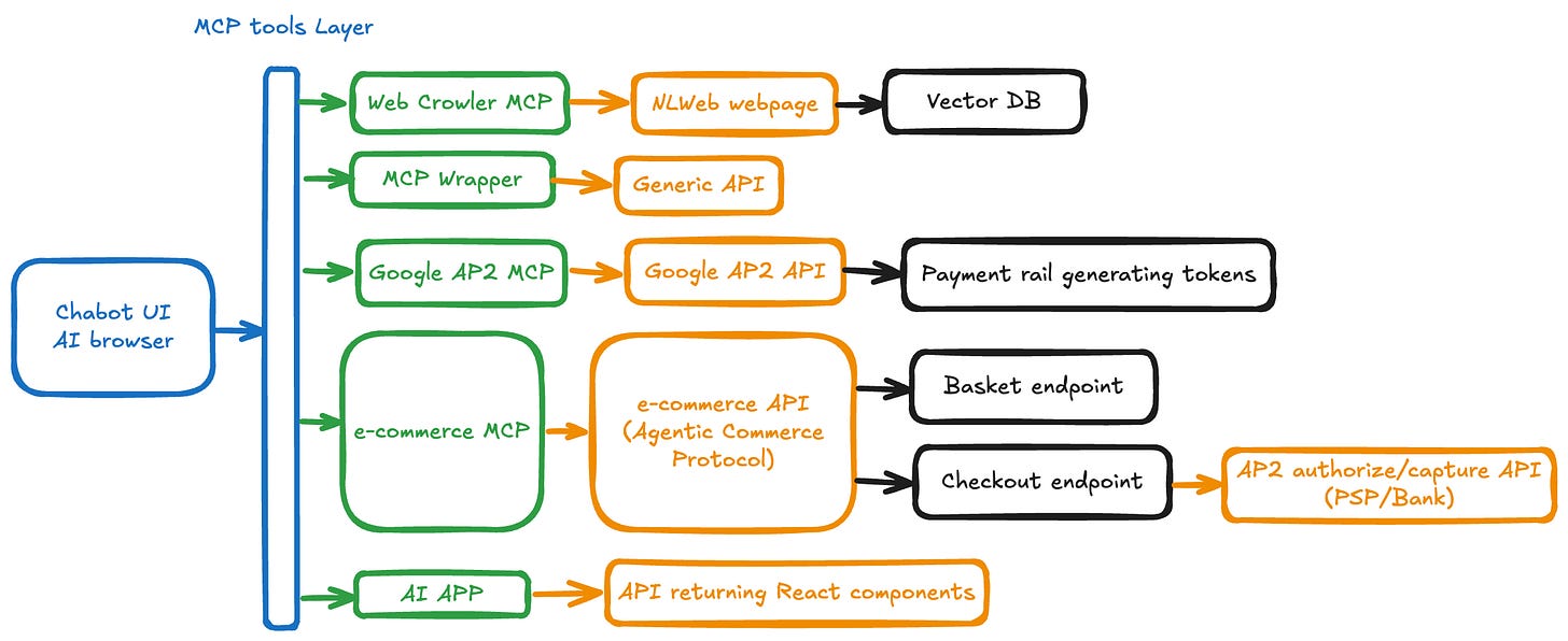Site (NLWeb): returns hits + suggested MCP toolsStripe Agentic Commerce Protocol